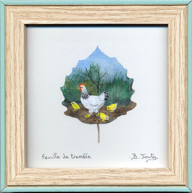Feuille de tremble (peuplier). Peinture originale sur une vraie feuille d'arbre. Le prix inclus le cadre et les dimensions données sont celle du cadre.